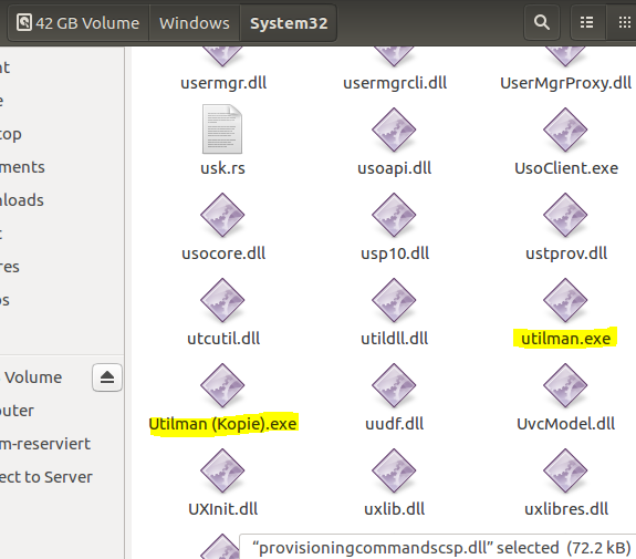 - In das Verzeichnis Windows/System32/ wechseln und dort die Datei utilman.exe in bspw. utilman.exe.bak umbenennen. Dann die cmd.exe in utilman.exe kopieren.