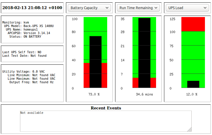 Beim Stöbern in den Kleinanzeigen bin ich auf eine nagelneue APC USV gestoßen. Das Gerät ist gerade mal ein Jahr alt und habe es für 60 Kröten ergattert. Daheim gleich mal an den KVM-Wirt angeschlossen und rumgetestet. Einfach Klasse so ein Teil. Ein Test am lebenden Objekt zeigt, dass die USV meinen AMD FX 8350 (2 x 1 TB Seagate RED) problemlos eine halbe Stunde atmen lässt bevor der Shutdown-Treshold greift, den ich bei 35 % Akkuladung eingestellt habe. Mit APCUPSd lässt sich obendrein noch mit Hilfe des Apache eine Seite mit der aktuellen Statusinfo anzeigen. Echt große Klasse! :-)